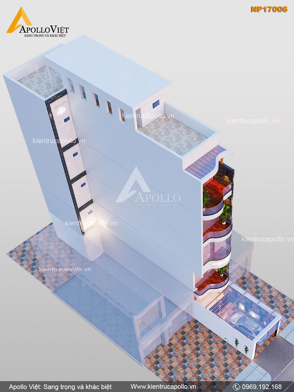 Thuận tiện hơn khi Spa được thiết kế nằm trên đường quốc lộ giao thông thuận lợi - vị trí đắc địa thu hút nhiều khách hàng hơn. Theo quy định về chỉ giới xây dựng cũng như quy định về số tầng đội ngũ KTS Apollo Việt đã nhanh chóng tư vấn và lên phương án đảm bảo cả về nhu cầu công năng lẫn thẩm mỹ cho công trình. Bố trí tum chiếm khoảng 50% diện tích sàn để bố trí tum thang, phòng kho cùng sân lớn để phơi đồ dùng trong các dịch vụ của spa.
